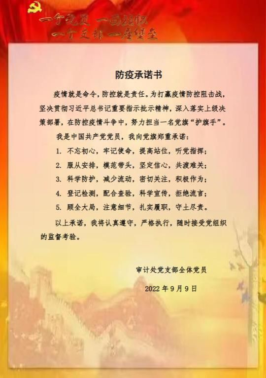 最后,支部全体党员郑重承诺,要把思想和行动统一到党中央的决策部署上来,统筹做好疫情防控和审计监督各项工作,加强政治理论和专业知识学习,不断提升自己的综合能力和审计专业水平,在防控疫情斗争中,努力担当一名光荣的党旗“护旗手”。
