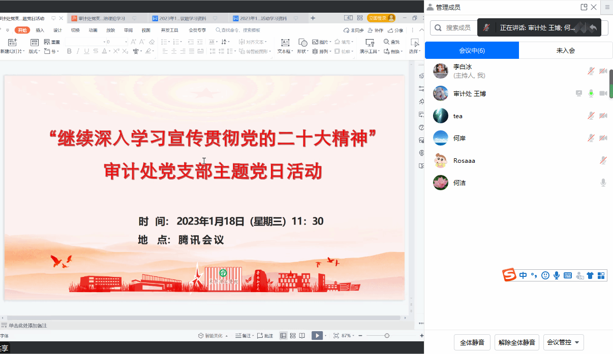 1月18日上午,在临近春节之际,审计处党支部以线上形式开展2023年1月份“继续深入学习宣传贯彻党的二十大精神”主题党日活动。党支部书记王博同志主持党日活动。支部全体党员和入党积极分子参加。