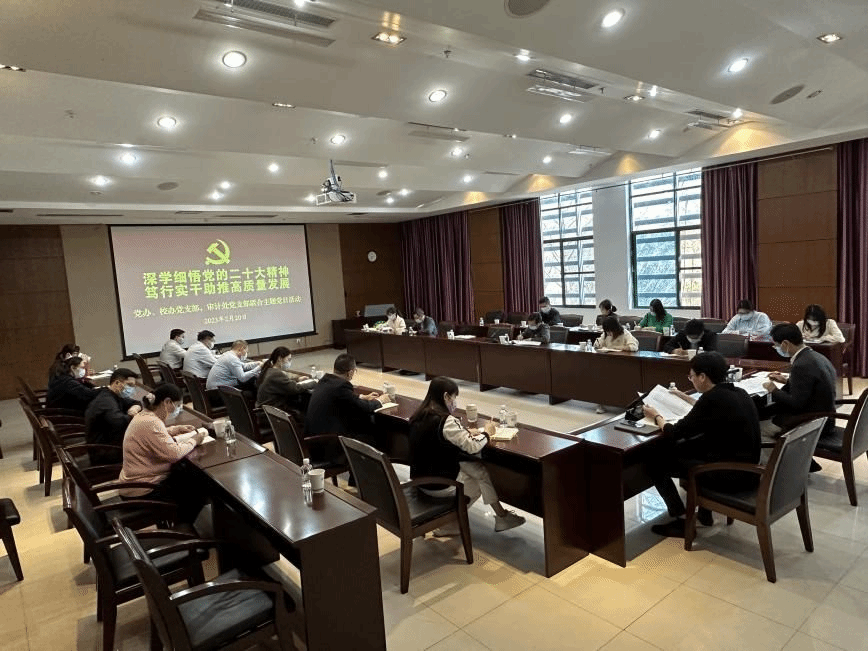 2月20日下午,党办、校办党支部和审计处党支部联合开展“深学细悟党的二十大精神,笃行实干助推高质量发展”主题党日活动。党办、校办党支部书记胡钦华同志主持。两个支部全体党员、积极分子参加。